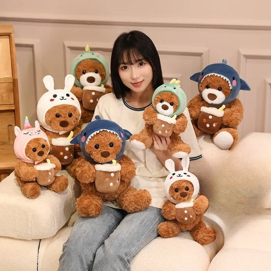 Cute Teddy Bear With Milk Bubble Tea And Animal(Shark/Rabbit/Dinosuar) Hat Dress Up Plush Toys 22/32